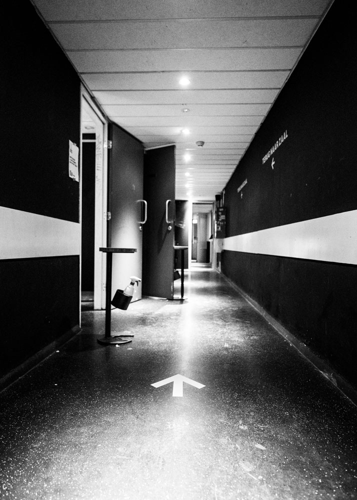 Je bedoelt politie agentje spelen? Uiteraard leven we de regels na. Debbie ontvangt het publiek bij de ingang, iedereen moet hun handen ontsmetten, de verplichte vragen worden gesteld en je wordt geplaceerd. Daarnaast hebben we eenrichtingsverkeer. In dit pand kun je van de ingang, langs de bar, de zaal inlopen. Wil je terug naar de bar? Dan loop je via de gang aan de zijkant van de zaal, waar zich ook het toilet bevindt, terug naar de ingang en kom je weer uit bij de bar. Het staat met pijlen aangegeven op de grond en de muur en ook onze comedians maken je daar nog een keer op attent.